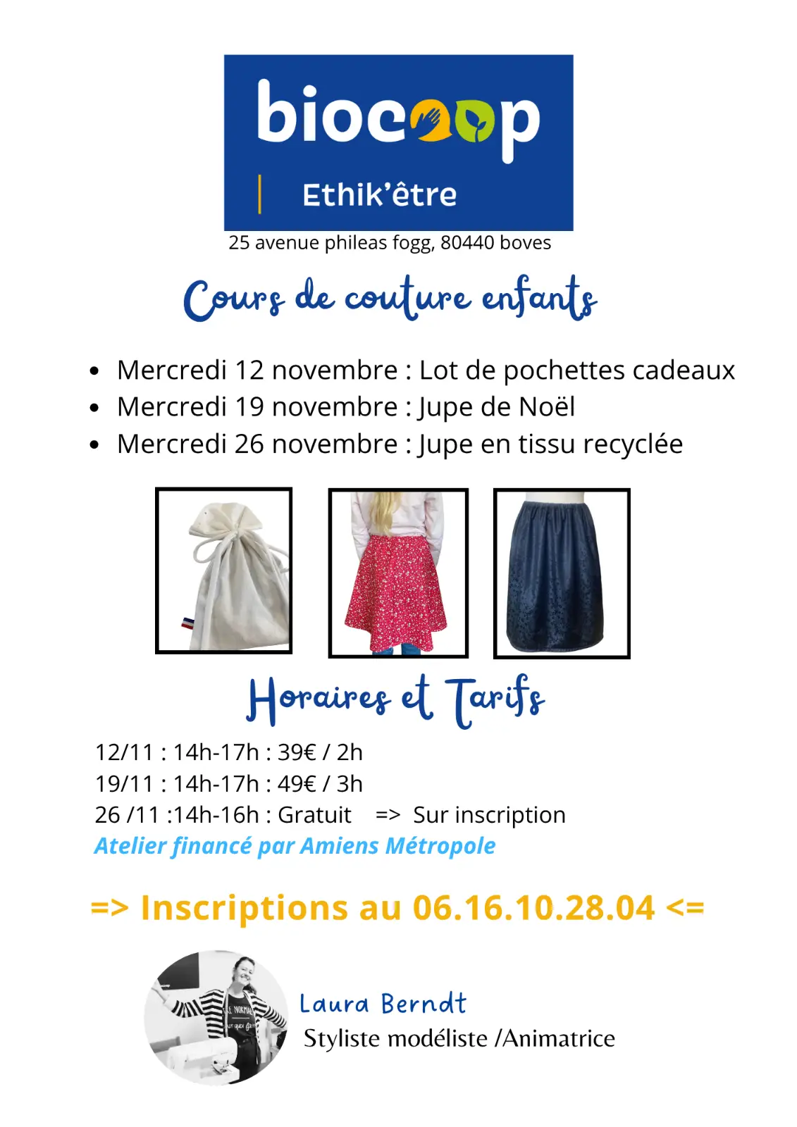 Laura de l'atelier Collectif Couture Somme vient avec ses machines, ses tissus, son matériel et sa petite valise à connaissances. Pendant un atelier de 2 ou 3h, apprenez et repartez avec vos réalisations.